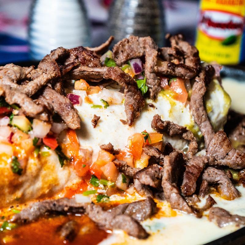 Steak, Chicken, Chorizo, Shrimp with bacon, onion, black beans, cactus, and fresh cheese, served on top of fresh guacamole, Green Salsa inside Molcajete, and Carnitas.