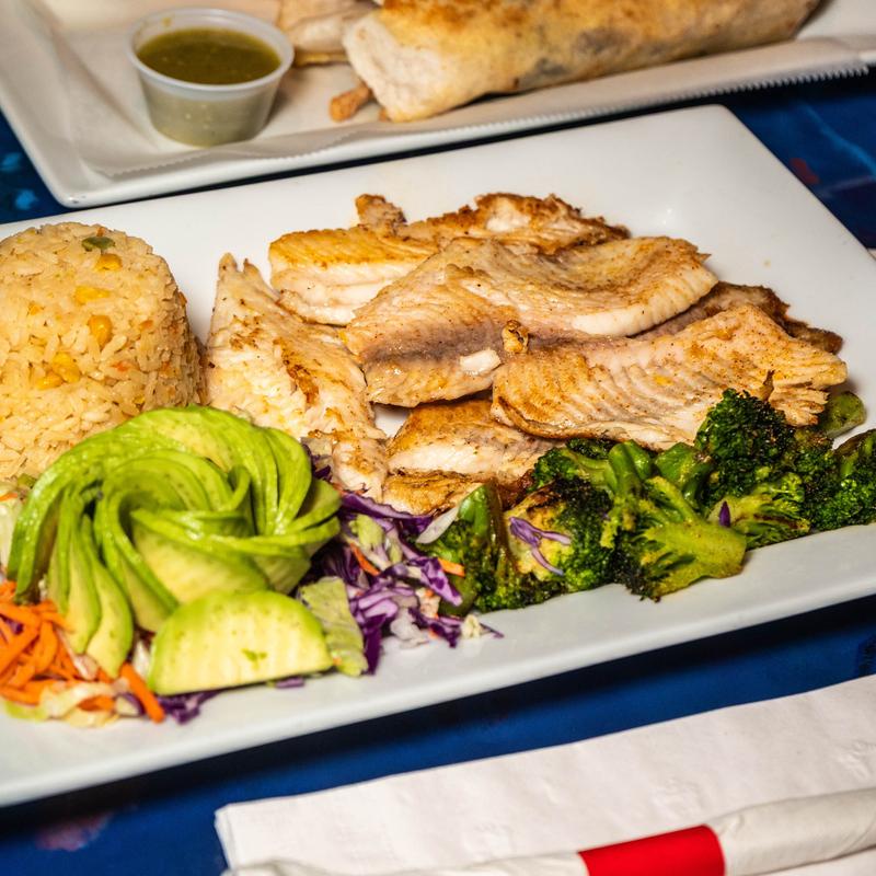 Deep-fried whole tilapia, served with white rice, lettuce, avocado slices, pico de gallo, and fries.