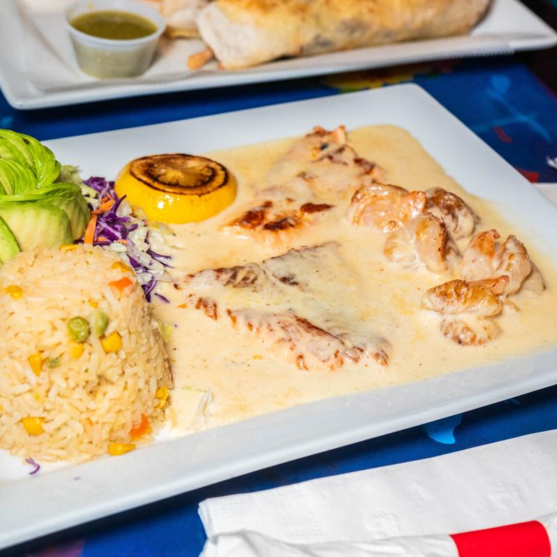 10 Jumbo shrimp seasoned in butter, chipotle sauce, zucchini, mushrooms, served with white rice, lettuce, cucumbers, and slices of avocado.