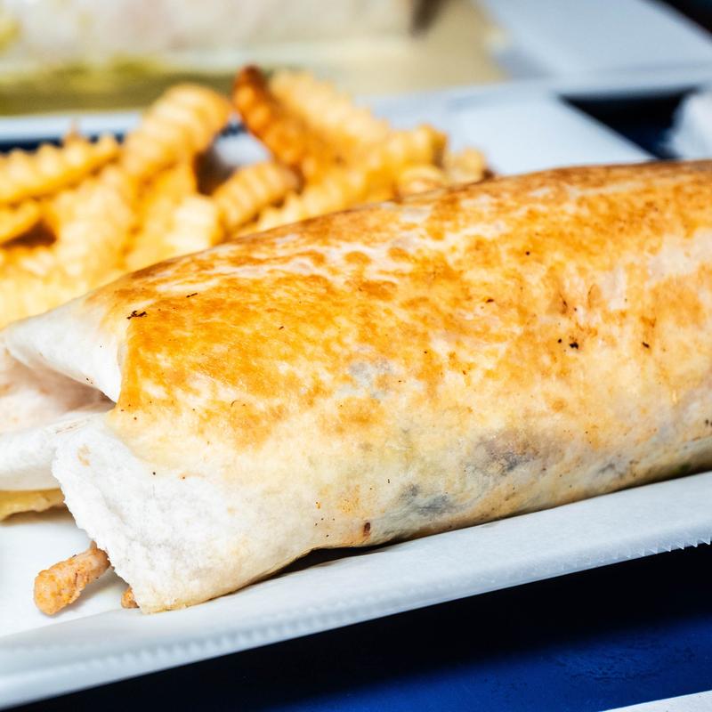 12" Grilled crispy tortilla filled with steak or chicken and four fried jumbo shrimp wrapped with bacon, black beans, rice, guacamole, and served with French fries and Cheese Sauce on the side.